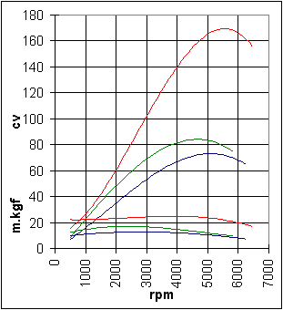 As curvas de potência (as mais altas) e de torque estimadas para o Chevette 1,6 original (em azul); com motor GM 2,5 original (em verde); e com o mesmo motor e a preparação atual (em vermelho) |